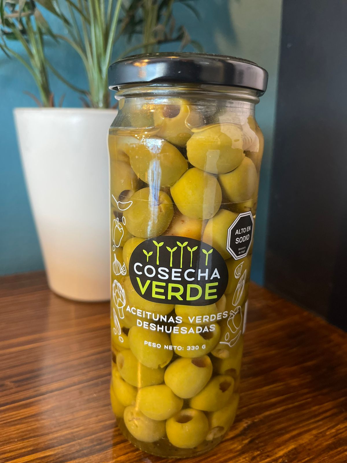 Frasco de aceitunas verdes deshuesadas, marca cosecha verde de 330 gramos.